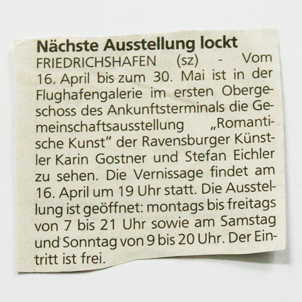 Flughafengalerie Friedrichshafen ...eine Ausstellung der Ravensburger Künstler Karin Gostner und Stefan Eichler ist vom 16. April bis zum 30. Mai 2010 in der Flughafengalerie Friedrichshafen ...