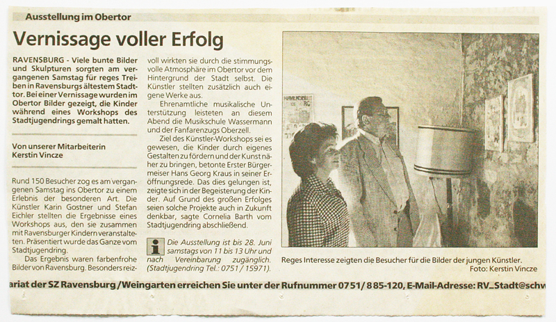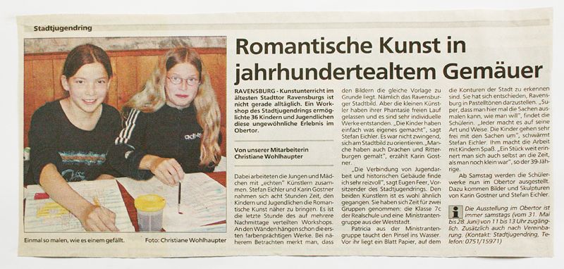 Bei der Ausstellung im Obertorturm leitete ich mit Stefan Eichler einen 8-Stunden-Workshop des Stadtjugendrings mit 36 Schülern. In dem alten Gemäuer erstanden Fantasiewelten mit Burgen und Drachen. Die Werke der Kinder wurden zusammen mit unseren Bildern ausgestellt.